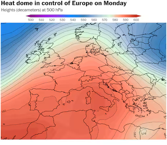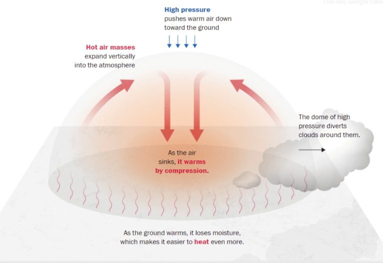 Το συνεχιζόμενο κύμα καύσωνα, αυτές τις ημέρες, στην κεντρική και δυτική Ευρώπη, τροφοδοτείται από ένα σύστημα υψηλής πίεσης που έχει σταματήσει πάνω από τη Δυτική Ευρώπη, γνωστό ως «θόλος θερμότητας». Αυτό το σύστημα παγιδεύει ζεστό, ξηρό αέρα στα κατώτερα ατμοσφαιρικά στρώματα, προκαλώντας σταθερή άνοδο της θερμοκρασίας. Κινούμενο προς τα ανατολικά, σταδιακά από αύριο Σάββατο 5/7, ο θόλος έλκει ακόμη περισσότερο ζεστό αέρα από τη Βόρεια Αφρική, εντείνοντας την ακραία ζέστη σε όλη την περιοχή μας.